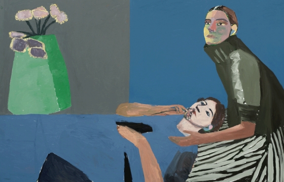 Waiting in the blue room, 2022, for instance, depicts two women sitting or lying down on a desert pink plane, looking blankly into the unpictured distance. The wall behind them is bifurcated in two—a grey side and a blue side—and a green vase with flowers fantastically floats atop the reposed figure. The title’s invocation of “waiting”, the distant gazes, and the unnaturalistic representation of objects in space contribute to an atmosphere of beguiling mystery that pervades the exhibition.